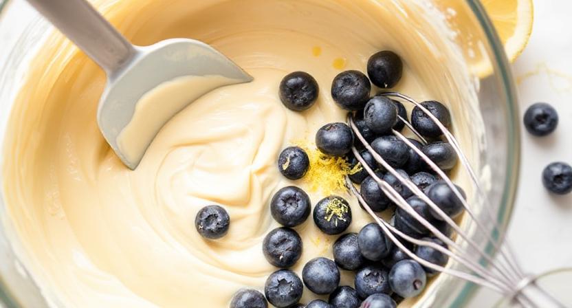 - Prepare the filling: In a mixing bowl, beat the softened cream cheese and sugar until smooth. Add eggs one at a time, mixing well. Incorporate vanilla, lemon juice, and lemon zest. Gently fold in blueberries.